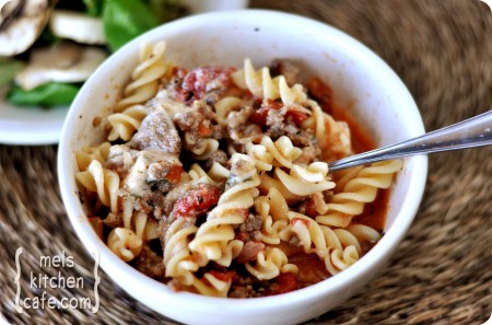 In a large 4-quart pot, add the Italian sausage and cook over medium heat, breaking the pieces up with a wooden spoon or spatula while it cooks. I prefer the sausage in fairly small pieces. After about 3-4 minutes, add the onion. Cook the sausage and onion together, stirring occasionally, until the sausage is cooked through and the onions are soft,a bout 5-7 minutes. Drain any excess grease, if desired. Stir in the garlic, oregano, red pepper flakes and tomato paste. Cook for 1-2 minutes, stirring constantly. Add the diced tomatoes with their juices, bay leaves and chicken broth. Add the basil, if using dried (if using fresh basil, add it in the next step).